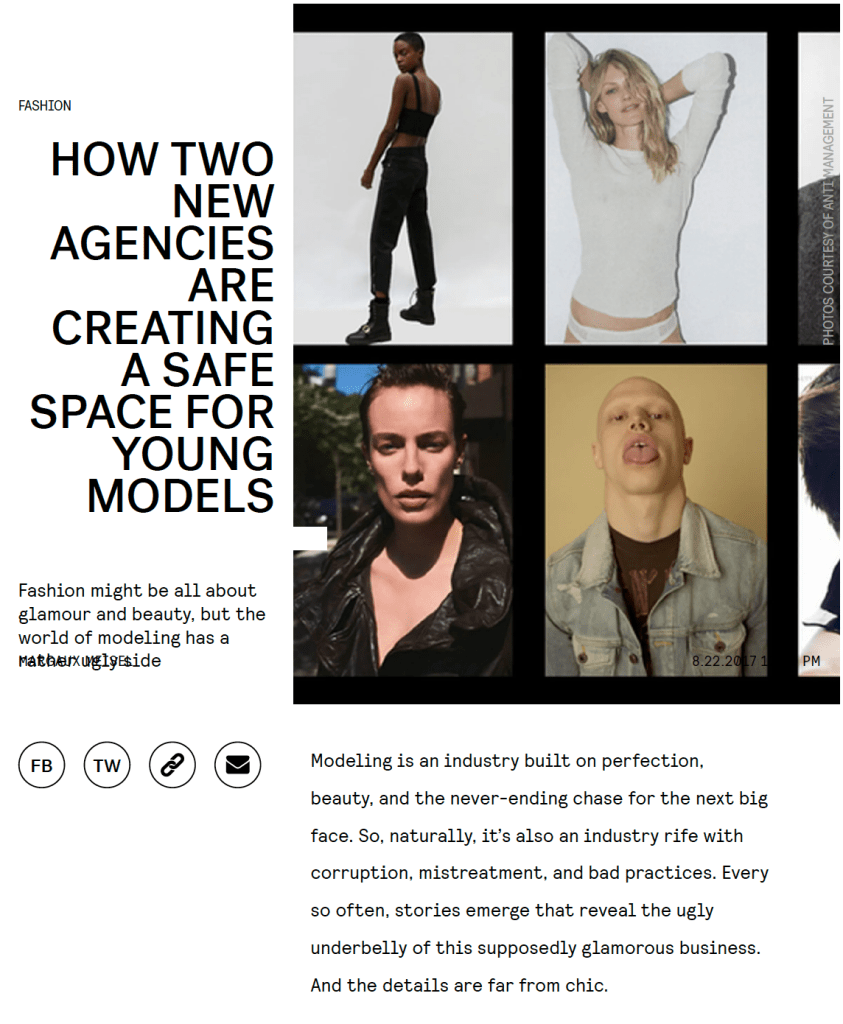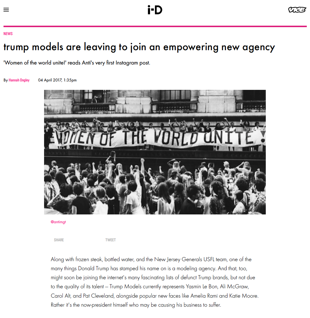 Celebrated cult fashion magazine I-D covers the demise of Trump Model Management and opening of Anti Management under new light.