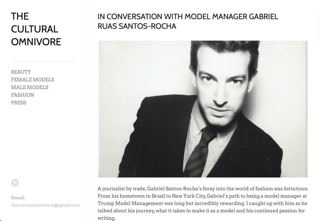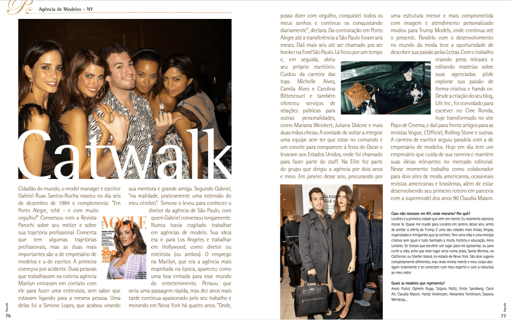 Gabriel reminisces about his career as a model agent in this 5-page interview for Brazilian magazine Parochi.